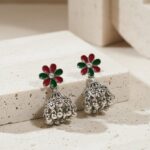Experience the perfect blend of traditional elegance and artistic charm with this Anoxidize Jhumka Set, beautifully crafted with a fusion of Meenakari detailing. Each piece showcases exquisite craftsmanship and intricate patterns, making it a timeless addition to your jewelry collection.
