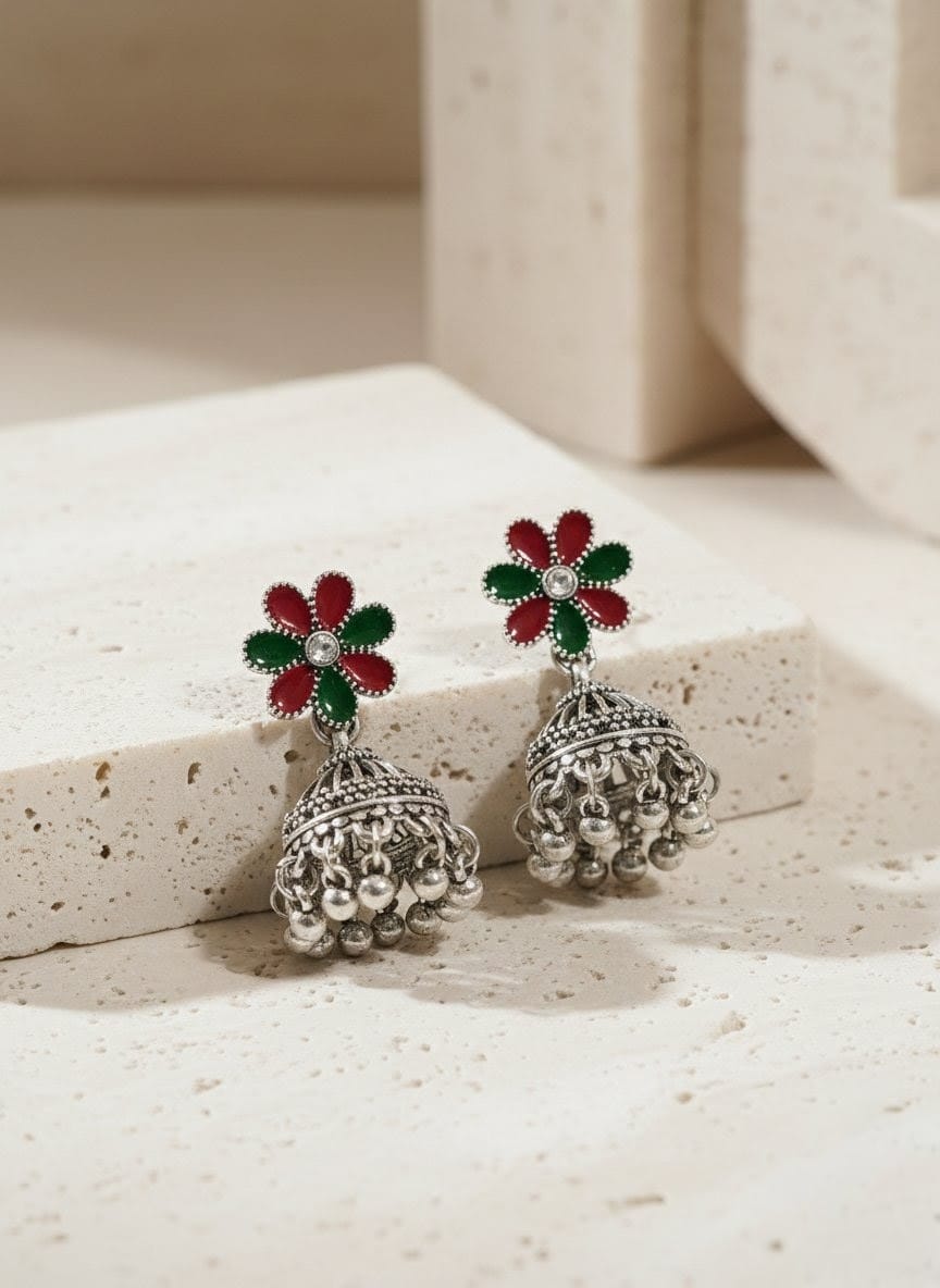 The oxidized silver tone combined with vibrant Meenakari colors creates a unique ethnic appeal, perfect for festive occasions, weddings, or daily traditional wear.