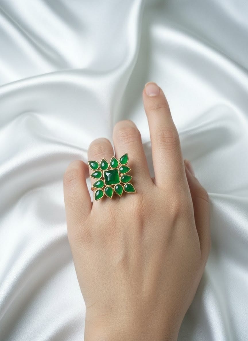 Make a bold statement with this Big Size Adjustable Ring, beautifully embellished with deep dark green stones. Its elegant traditional design adds a royal charm, making it perfect for festive occasions, weddings, or party wear. The adjustable band provides a comfortable and secure fit for any finger size.