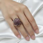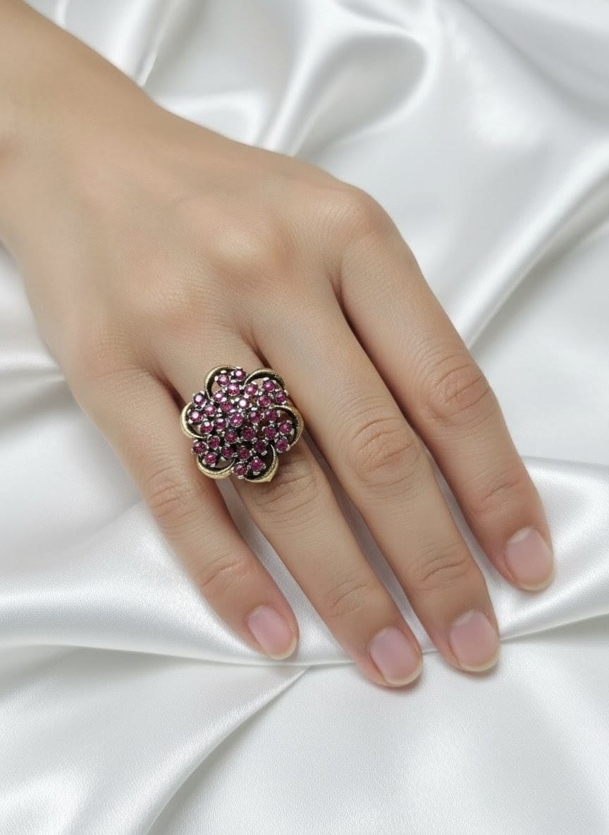 Add a touch of elegance to your look with this Big Size Adjustable Ring, beautifully designed in a traditional flower style and adorned with dark pink stones. The vibrant color and intricate detailing make it a perfect statement accessory for festive events, weddings, or party wear. Its adjustable design ensures a comfortable fit for all.