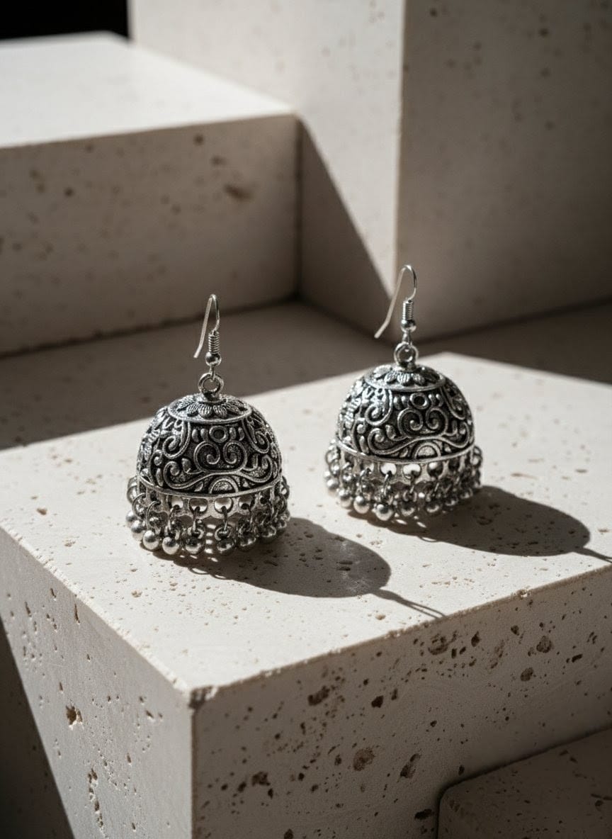 Elevate your traditional style with this classic silver oxidized heavy jhumka set, crafted with intricate detailing and a timeless antique finish. Designed to give a bold and regal look, this jhumka set is perfect for weddings, festive occasions, and cultural events.