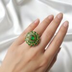 Add a royal charm to your festive look with this Big Size Adjustable Ring, featuring shimmering emerald green stones set in a traditional floral design. Its elegant craftsmanship and bold color make it a perfect statement piece for any festive or wedding outfit. The adjustable fit ensures comfort and style for every hand size.