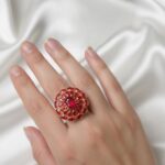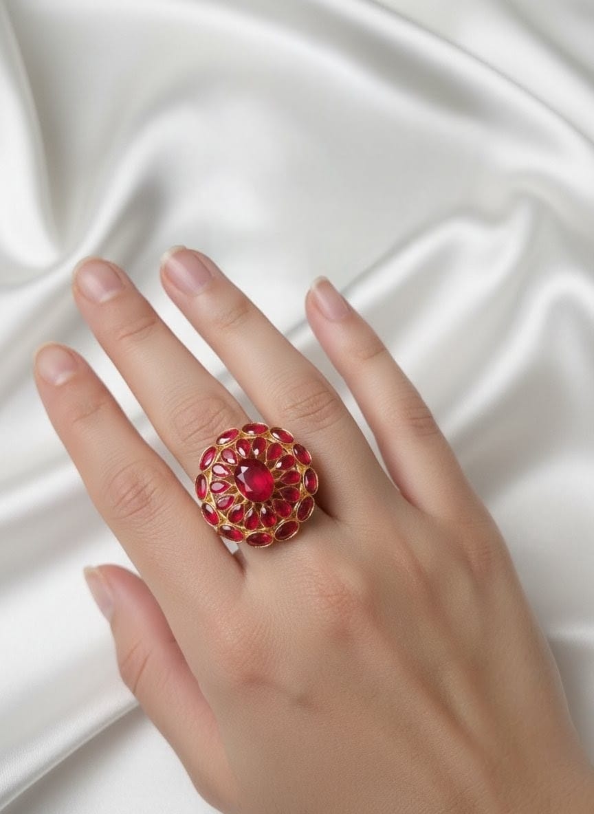 Make a bold statement with this Festive Big Size Adjustable Ring, beautifully adorned with Ruby Red stones. The elegant craftsmanship and rich red hues bring a touch of royalty to your festive and formal looks. Designed with comfort in mind, its adjustable fit ensures it suits all hand sizes perfectly.