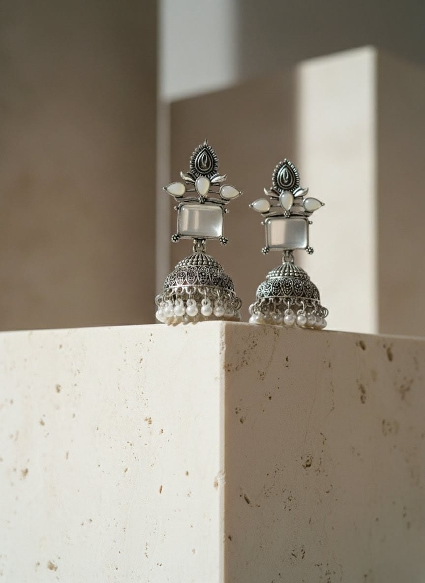 Step into timeless elegance with these Mughal art–inspired Jhumka earrings, featuring a stunning fusion of Polki and Kundan craftsmanship. Designed with intricate detailing and royal aesthetics, this pair reflects the luxury and grandeur of traditional Mughal jewelry.