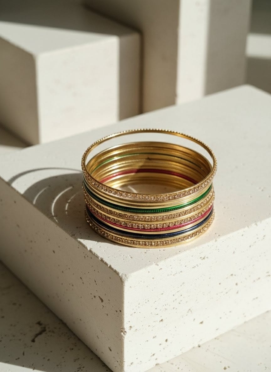 Add a touch of sparkle to your look with this multicolor gold metal bangle set, designed to blend traditional charm with modern elegance. Crafted from premium-quality metal and finished in rich golden tones, these bangles are perfect for festive occasions, weddings, and everyday wear.