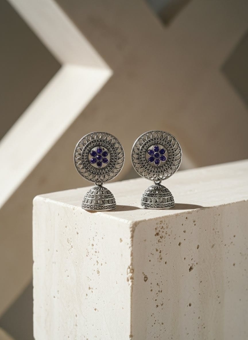 Celebrate cultural artistry with this oxidized jhumka set, beautifully infused with a circular Ajrak-inspired pattern. Each pair reflects the essence of traditional Sindhi craftsmanship blended with modern elegance. The antique oxidized finish and intricate detailing make it a perfect piece for every festive or casual occasion.