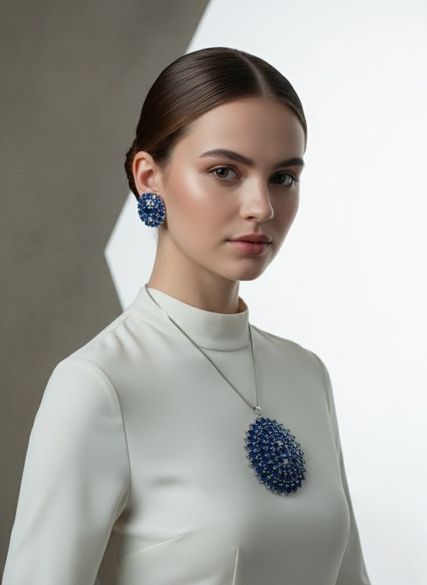 Turn heads with this Silver Big Pendant Set, featuring high-quality faux sapphire stones that radiate elegance and class. The set includes a silver chain pendant and a matching pair of earrings, making it a perfect choice for both formal and festive occasions. Crafted with care, it combines luxury, shine, and timeless beauty in one elegant piece.