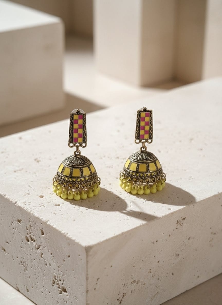 Sunflower Yellow & Pink Contrast Jhumka Set – Heavy Look, Lightweight Feel